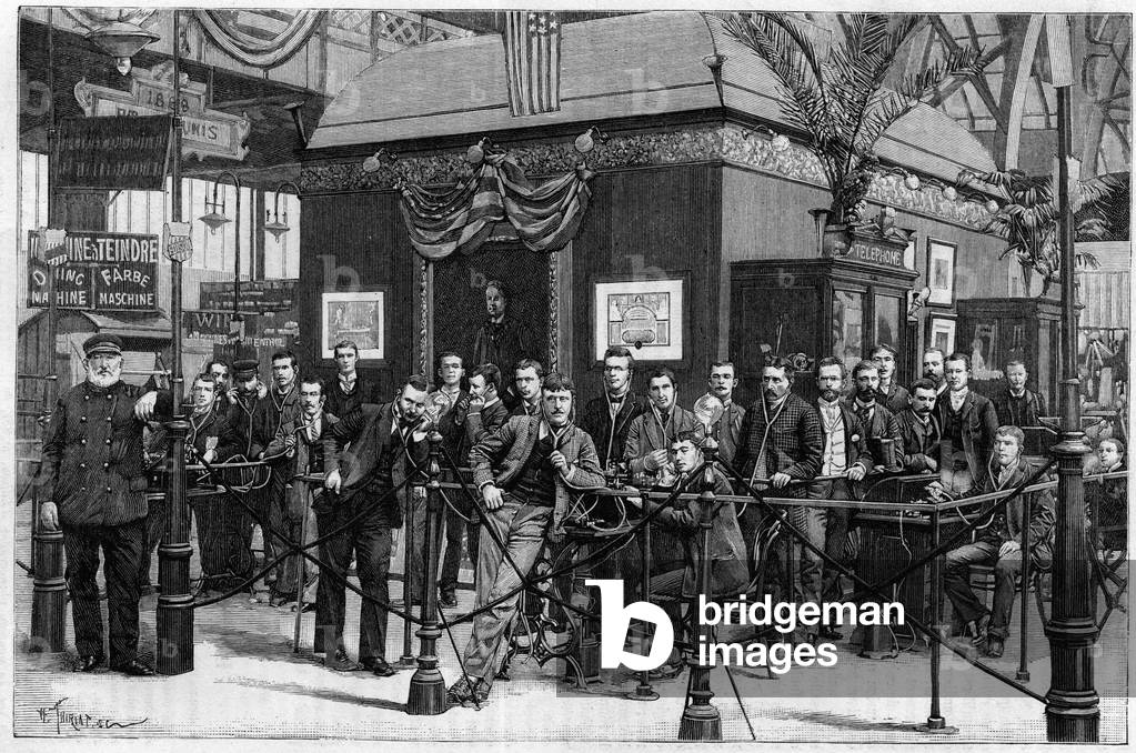 1889年のパリ万国博覧会では、エジソン式フォノグラフがガリエリ・デ・マシーヌ館に設置され、来場者が録音再生を体験する「オーディション」の場面が8月の日付をもつ版画として残されており、博覧会のなかで録音技術が独立した見世物になっていたことがわかります。トーマス・アルバ・エジソン(Thomas Alva Edison, 1847–1931)は8月中旬にエッフェル塔を訪れ、塔の設計者ギュスターヴ・エッフェル(Gustave Eiffel, 1832–1923)に「スペクタクル」型クラスMフォノグラフを贈呈したとされ、この面会シーンは現在もエッフェル塔の展示で再現されています。